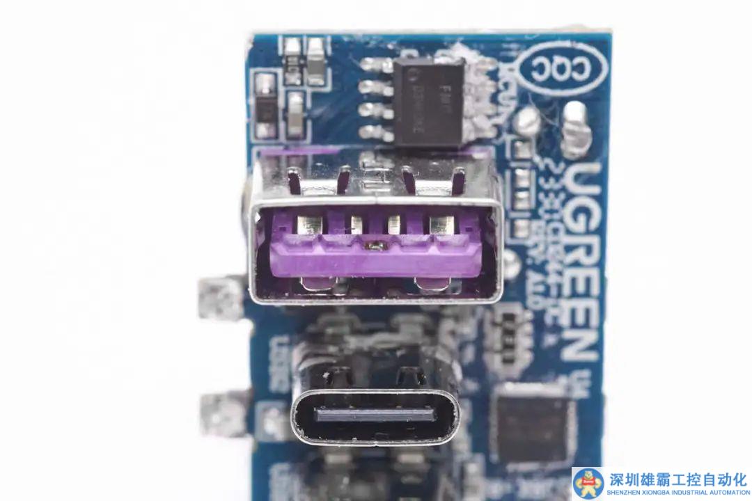 USB-A母座采用紫色膠芯,前端設(shè)有輔助觸點(diǎn)。