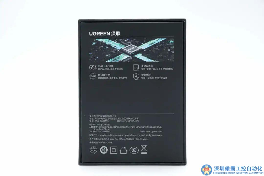 包裝盒正面印有UGREEN綠聯(lián)品牌、充電器名稱、外觀以及賣點(diǎn)等,采用了氮化鎵技術(shù)和智能溫控技術(shù),可為手機(jī)、平板、筆電等設(shè)備快充,60分鐘可為MacBook Air 13充電70%。