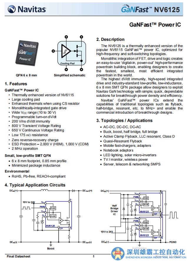 氮化鎵功率開關(guān)管采用納微NV6125,其內(nèi)置驅(qū)動(dòng)器,無需外置驅(qū)動(dòng)器,175mΩ導(dǎo)阻,耐壓650V,支持2MHz開關(guān)頻率,采用散熱增強(qiáng)的QFN6*8mm封裝,適用于升壓,降壓,半橋,全橋開關(guān)電源等諸多應(yīng)用場(chǎng)合。