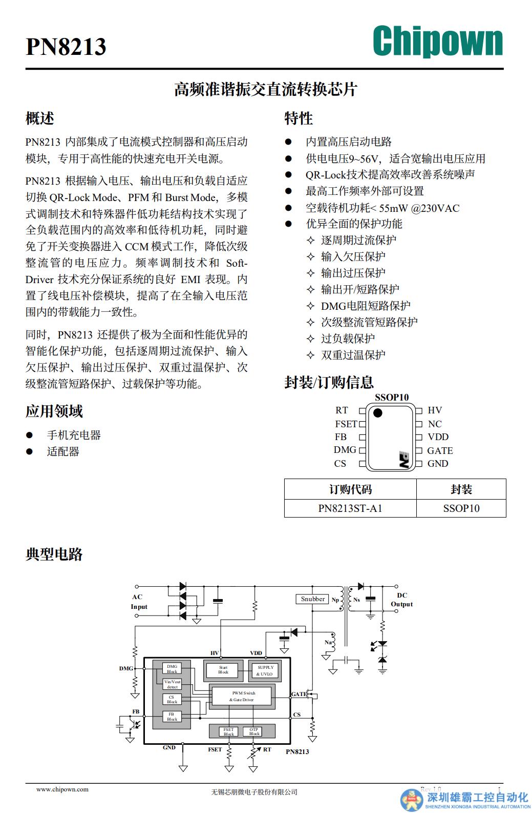 PN8213還內(nèi)置了全面的保護(hù)功能,包括逐周期過流保護(hù)、輸入電壓保護(hù)、輸出過壓保護(hù)、雙重過熱保護(hù)、次級(jí)整流管短路保護(hù)以及過載保護(hù)等保護(hù)功能。芯片采用SSOP10封裝,支持PD快充和適配器使用。