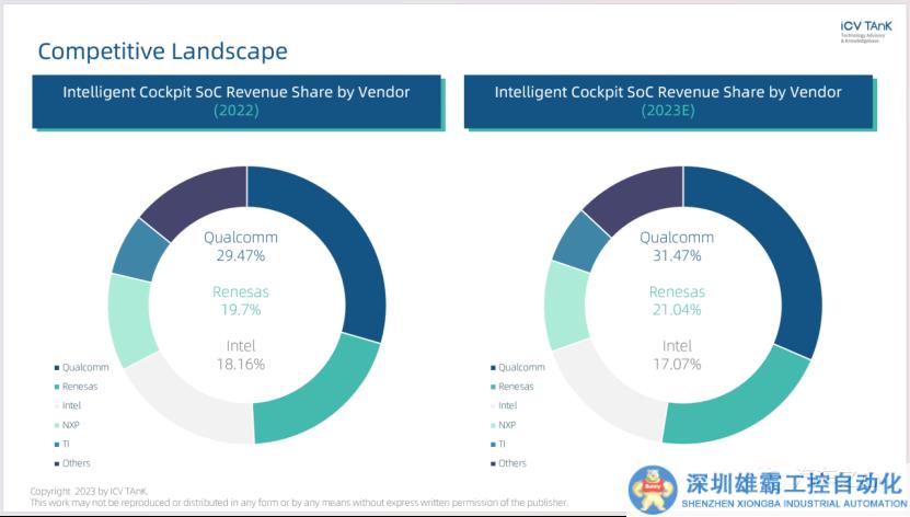 據(jù) ICV 最新報(bào)告顯示,2022 年,中國(guó)智能座艙 SoC 市場(chǎng)規(guī)模達(dá)到 14.86 億美元,預(yù)計(jì)到 2027 年將增長(zhǎng)至 35.23 億美元,年復(fù)合增長(zhǎng)率為 15.48%。智能座艙芯片 Top 3 供應(yīng)商占據(jù)近七成市場(chǎng)份額,高通位居第一。