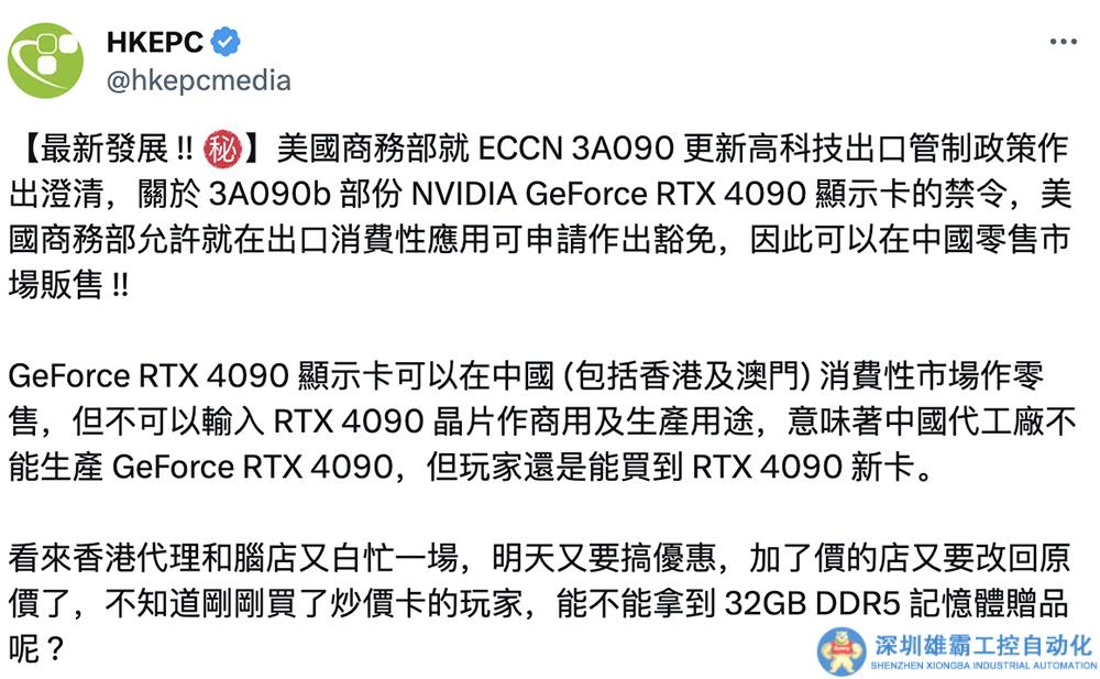 另據(jù)港媒HKEPC報道,美國商務部就出口管制文件作出澄清,關于RTX 4090禁令,出口消費級應用可申請作出豁免,因此RTX 4090可以在中國零售市場售賣,只是不能用作商用及生產(chǎn),中國代工廠不能生產(chǎn)RTX 4090。但由于該消息并未標注明確來源,真實性尚待考證。