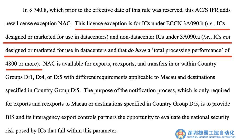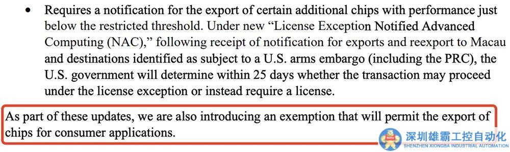 出口管制新規(guī)還為具有AI功能的消費級芯片增加了經(jīng)通報的先進計算許可例外(NAC)。此許可例外適用于3A090.b和3A090.a規(guī)則下的芯片,即在收到向中國等地出口、再出口及轉(zhuǎn)運的通報后,美國政府將決定是否可以適用該許可例外或需要許可證。