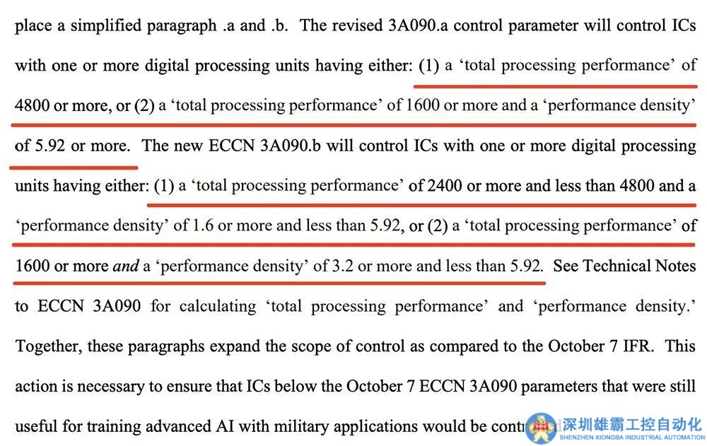 去年10月7日實施的出口管制版本,主要是限制“處理性能”和“互連帶寬”,處理性能限制閾值是所有處理器單元的“位寬x算力(bits x TOPS)”總和≥4800,互連帶寬的限制閾值是總雙向傳輸速率達到或可編程到≥600Gb/s。