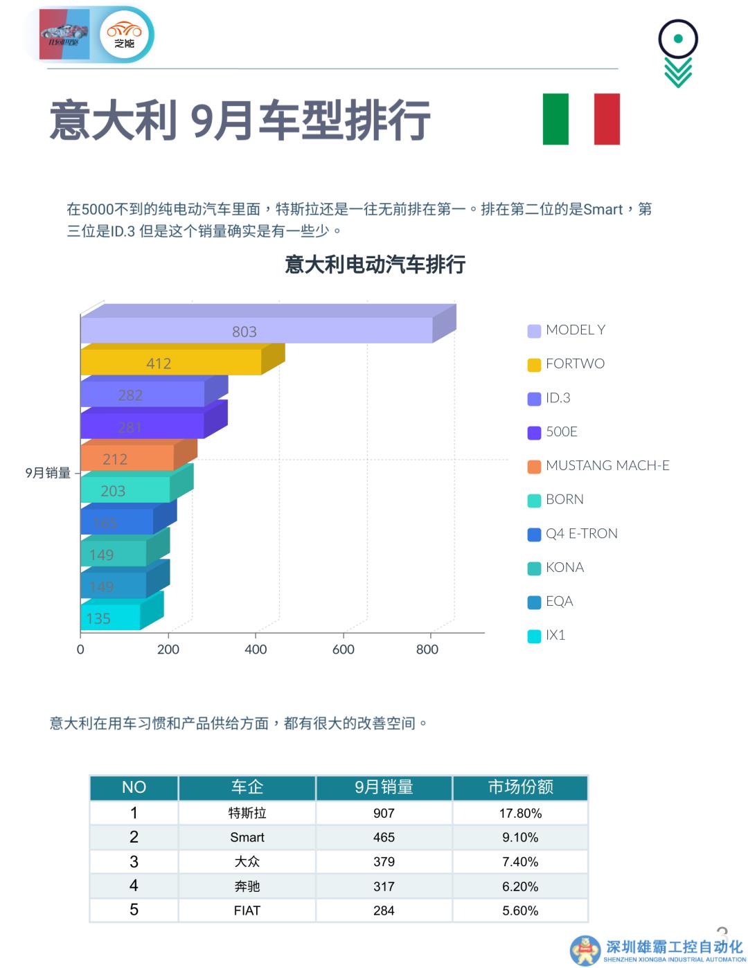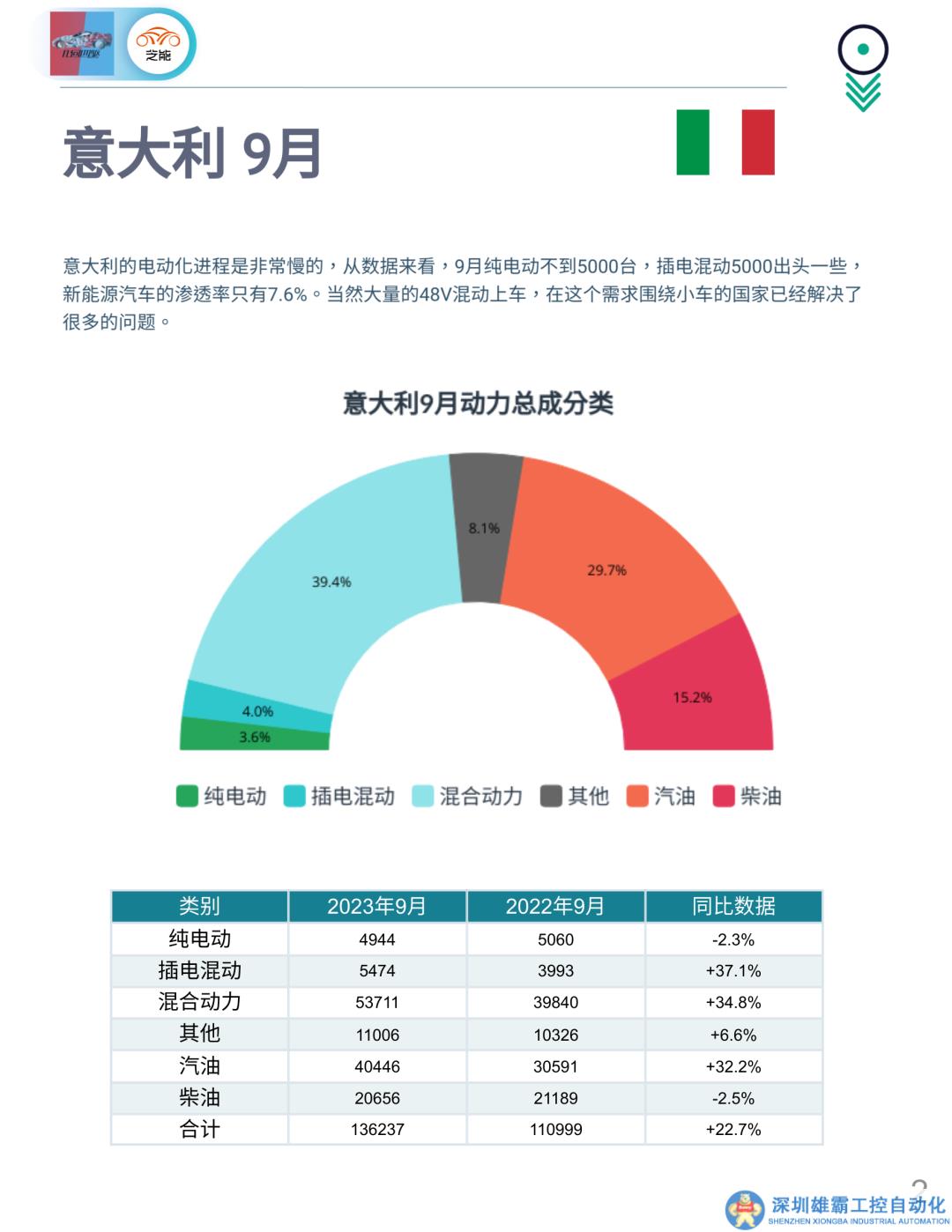 意大利的電動化進程是非常慢的,從數(shù)據(jù)來看,9月純電動不到5000臺,插電混動5000出頭一些,新能源汽車的滲透率只有7.6%。當然大量的48V混動上車,在這個需求圍繞小車的國家已經(jīng)解決了很多的問題。