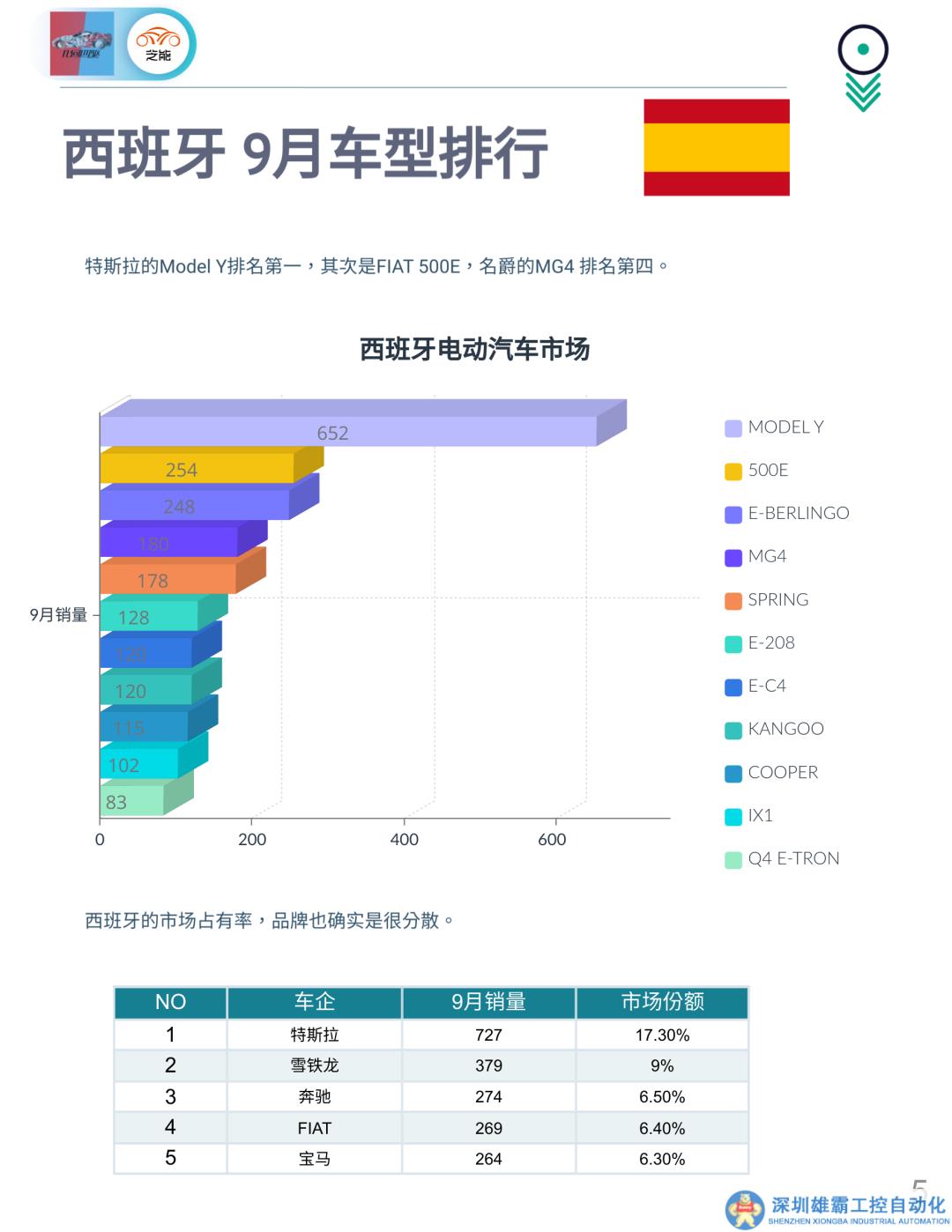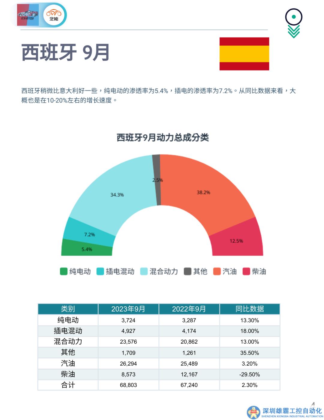 西班牙稍微比意大利好一些,純電動的滲透率為5.4%,插電的滲透率為7.2%。從同比數(shù)據(jù)來看,大概也是在10-20%左右的增長速度。