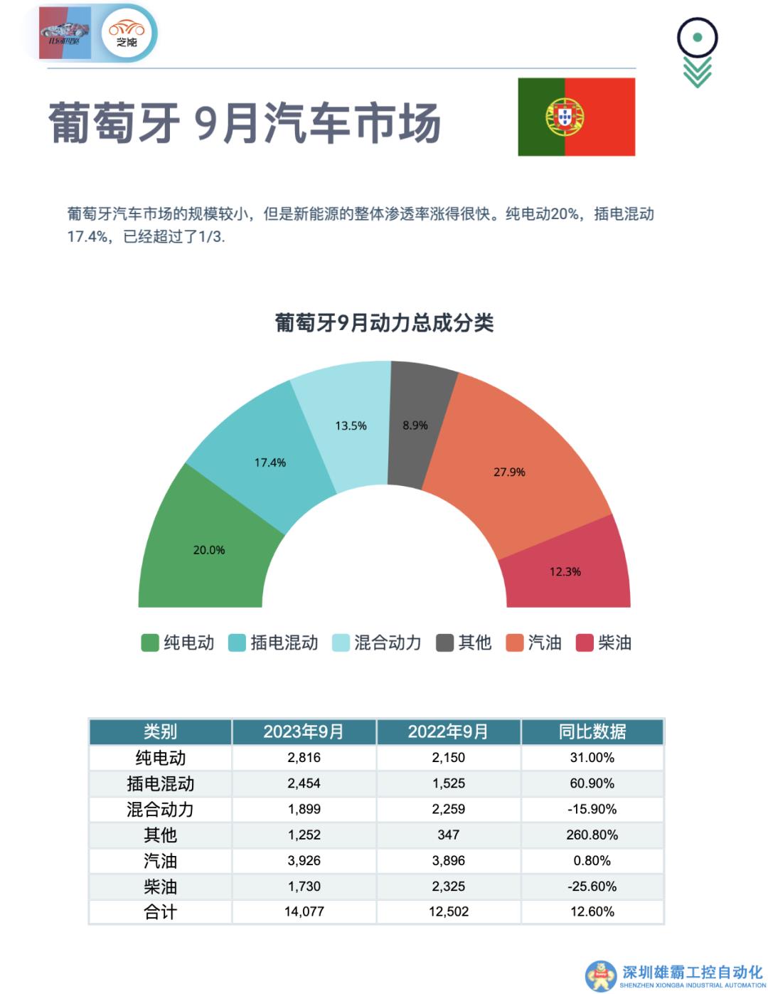 葡萄牙汽車市場的規(guī)模較小,但是新能源的整體滲透率漲得很快。純電動20%,插電混動17.4%,已經(jīng)超過了1/3。