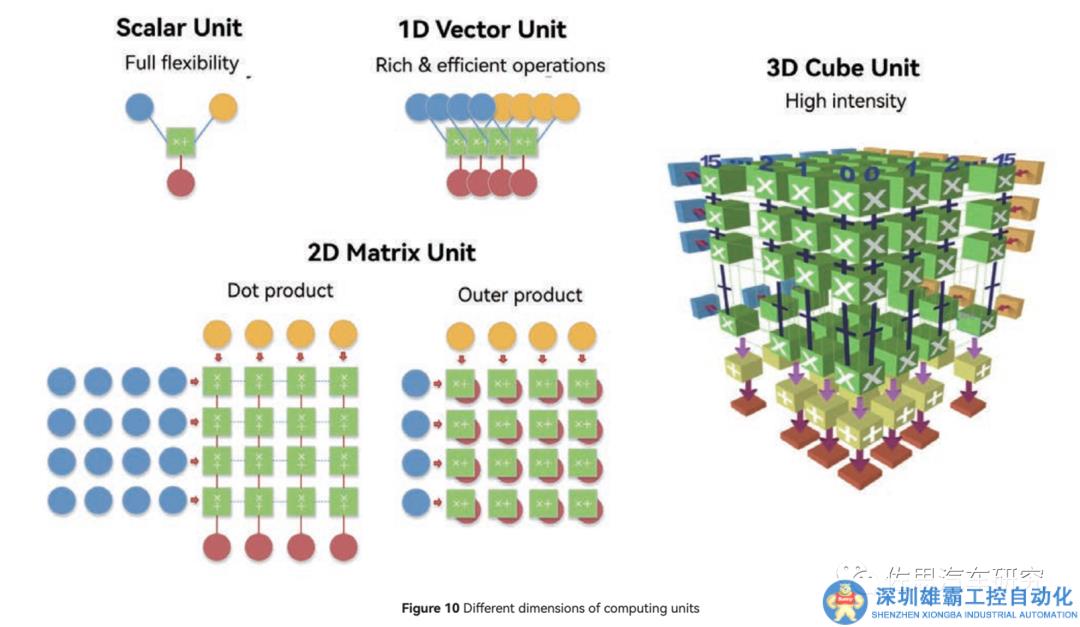 標(biāo)量基本近似CPU,靈活性最高,但針對(duì)AI運(yùn)算力最低。1D矢量近似于GPU,靈活性居中,AI算力中等,CUBE針對(duì)2D矩陣,也就是一般意義上的張量。