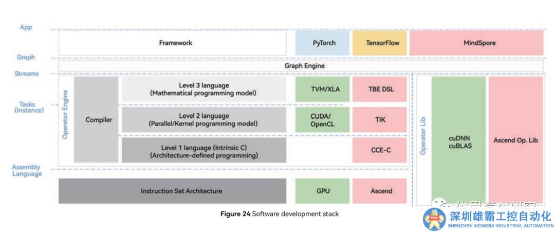 上圖是昇騰的軟件開(kāi)發(fā)棧,CUDA還是必須使用,算子庫(kù)還是常見(jiàn)的cuBLAS,英偉達(dá)的GPU此時(shí)會(huì)更占優(yōu)勢(shì)。