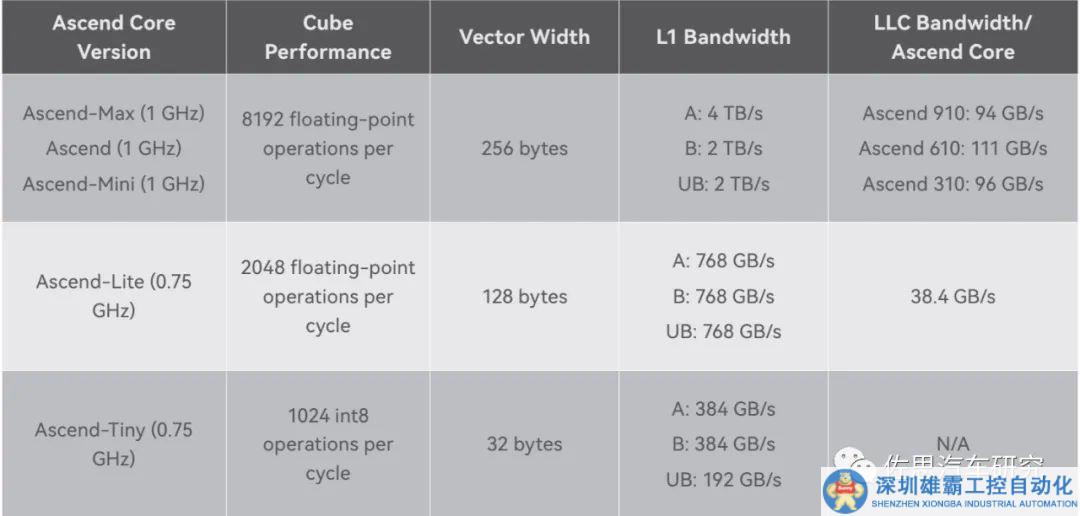 昇騰核心即AI核,分原始、Max、Mini、Lite、Tiny幾個(gè)版本,針對(duì)不同的應(yīng)用使用不同的核心和數(shù)量配置,如針對(duì)手機(jī)領(lǐng)域的麒麟990,是兩個(gè)Lite和一個(gè)Tiny核心,三個(gè)加起來(lái)是6.88TOPS@INT8算力。昇騰310則是兩個(gè)Mini核心,昇騰610則是10個(gè)原始核心,昇騰910是32個(gè)Max核心。昇騰620可能是10個(gè)Max核心。每個(gè)核心基本是相同的,主要是緩存配置和頻率配置不同。