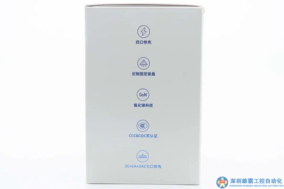 側面印有四口快充、定制固定吸盤、氮化鎵科技、CCC&CQC雙認證、2C+2A+3AC七口供電五大特性標識。