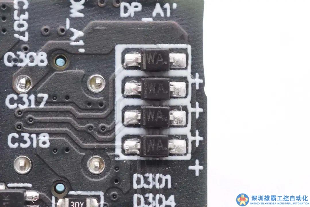 四顆絲印WA的TVS二極管用于USB-C接口靜電保護。