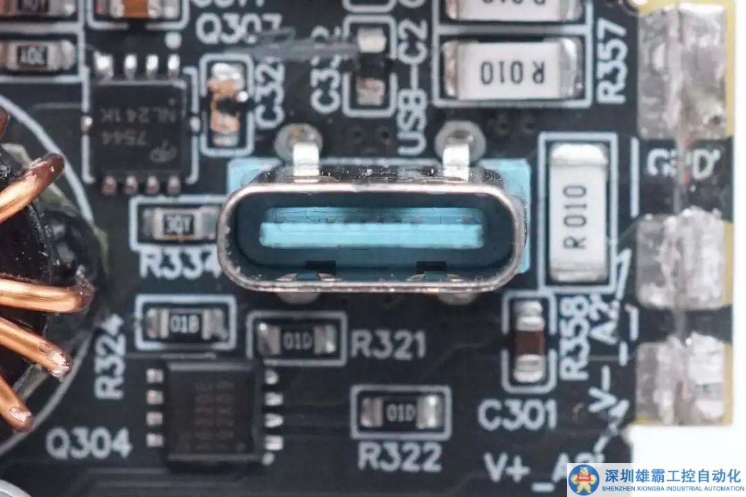 USB-C母座采用藍色膠芯,過孔焊接固定。
