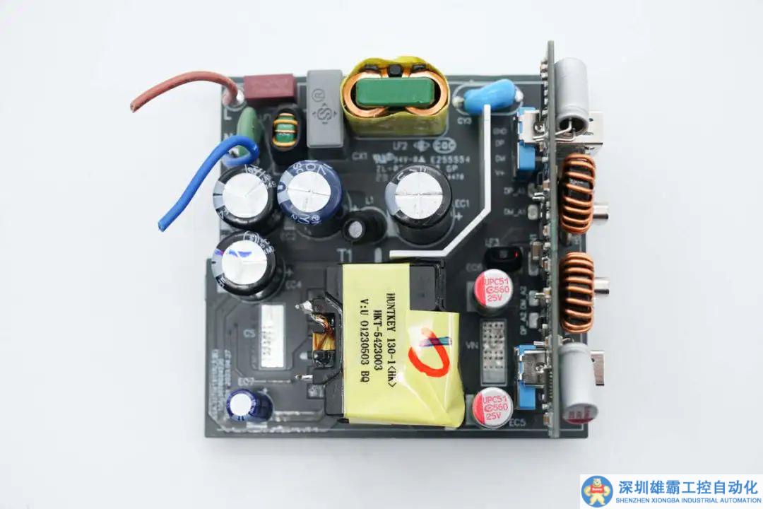 快充PCBA模塊一覽,左上角焊接保險絲,NTC熱敏電阻,共模電感,安規(guī)X2電容。下方焊接高壓濾波電容,底部焊接開關變壓器,右側焊接濾波電容和輸出降壓小板。
