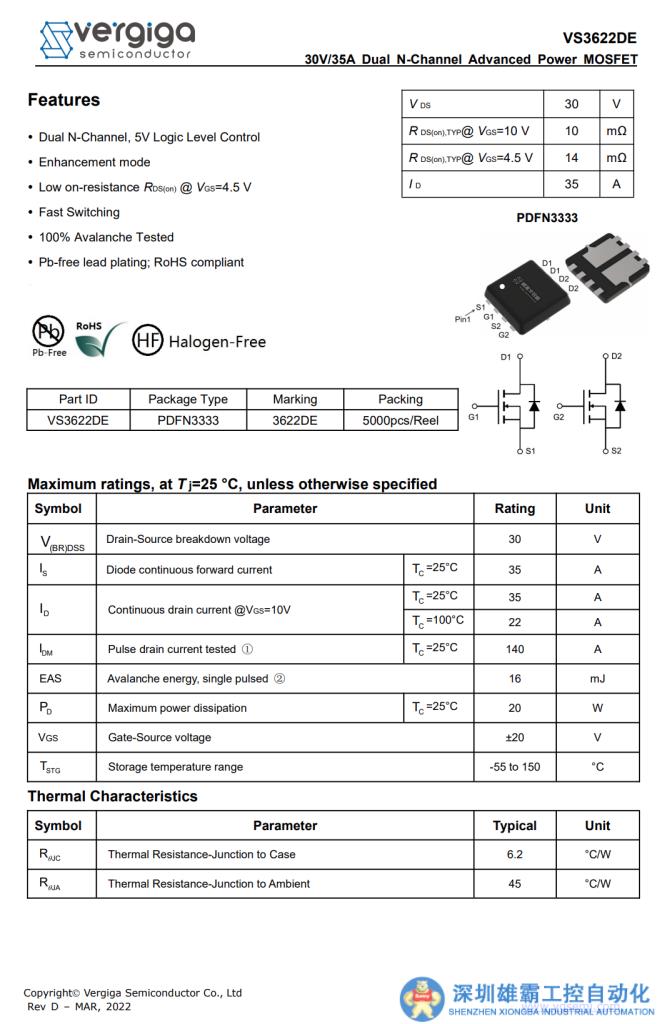 VBUS開關管來自威兆半導體,型號VS3622DE,雙NMOS,耐壓30V,導阻10mΩ,支持5V邏輯電壓驅動,采用PDFN3333封裝。
