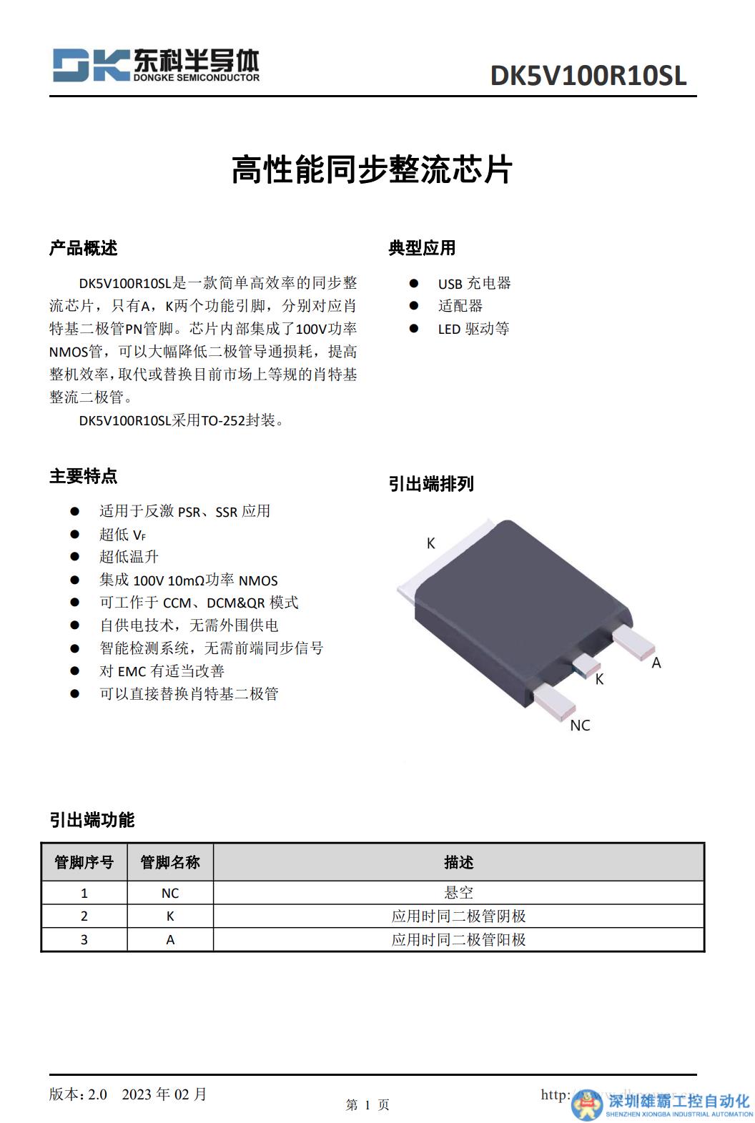 東科DK5V100R10SL支持CCM/DCM/QR工作模式,內置智能檢測,無需同步信號。芯片具備自供電技術,無需外圍元件,適用于USB PD快充,電源適配器和LED驅動電源,采用TO252封裝。