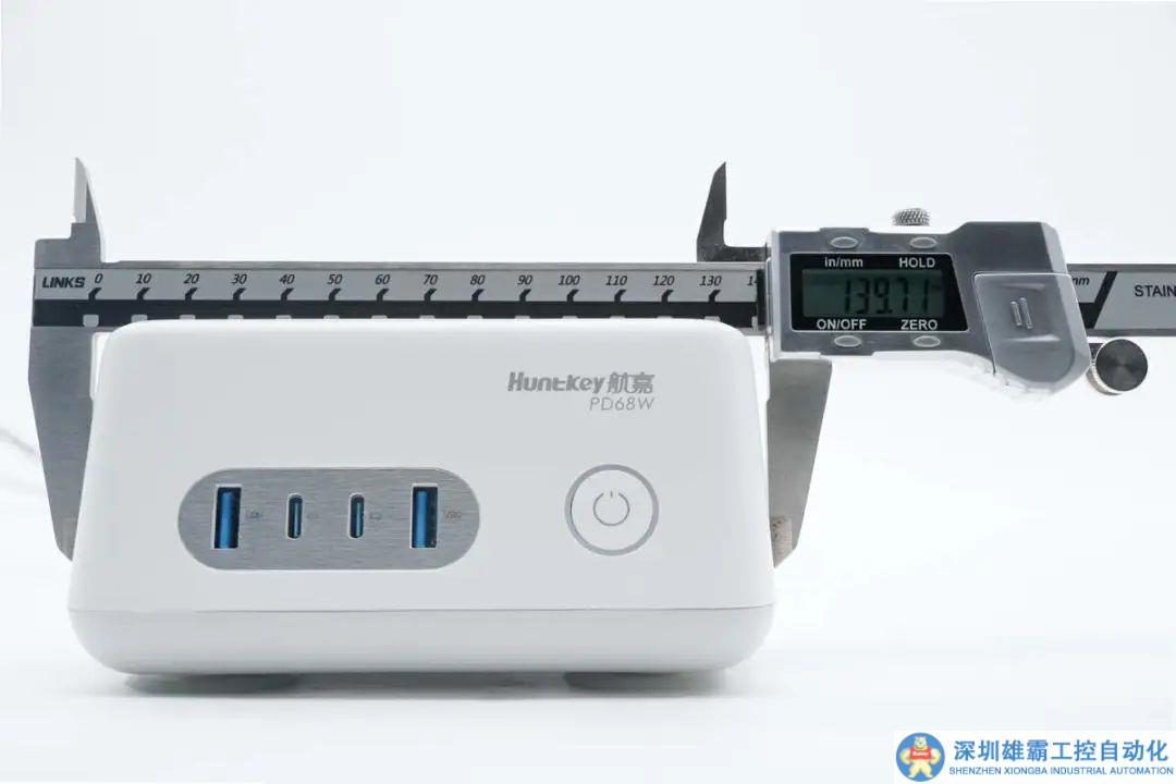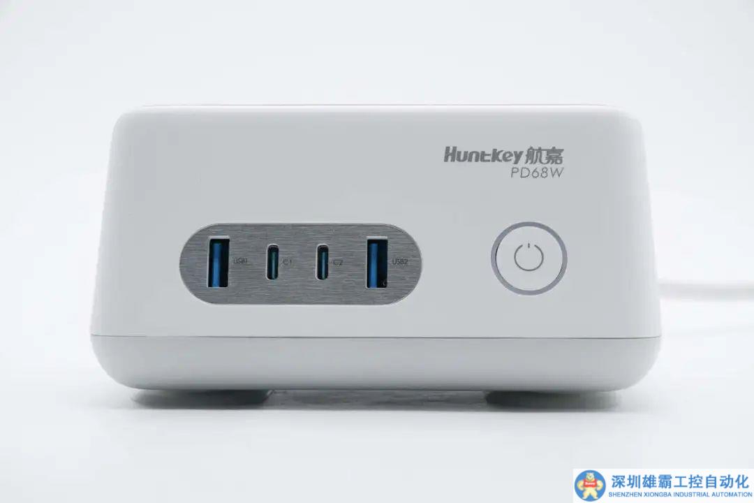 機身前端設有總開關按鍵、指示燈環(huán)以及2C2A四個USB接口,右上角外殼印有Huntkey航嘉和PD68W。