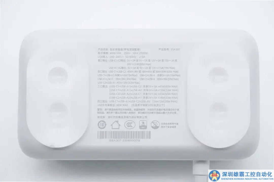 航嘉充吧W68自帶能夠接地安全使用的三腳插頭電源線,機身造型則與此前拆解過的充吧W100相同。機身外殼采用高溫阻燃PC材質,表面細紋磨砂工藝處理,手感順滑。