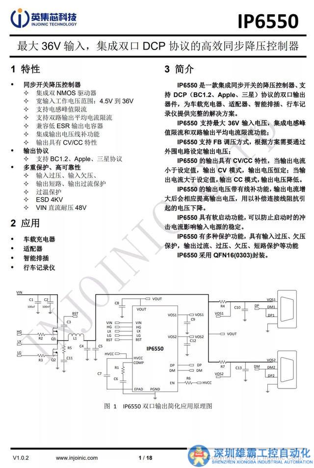 用于降壓輸出的同步整流降壓控制器來自英集芯,型號為IP6550,是一款支持36V輸入的同步降壓控制器,內置NMOS管驅動,外置兩個MOS管進行高效同步整流降壓。IP6550通過反饋引腳調節(jié)輸出電壓。開關頻率135KHz,輸入端耐壓48V,內置完善的保護功能。英集芯IP6550采用3*3mm QFN16封裝,可實現簡化的同步降壓轉換電路設計。