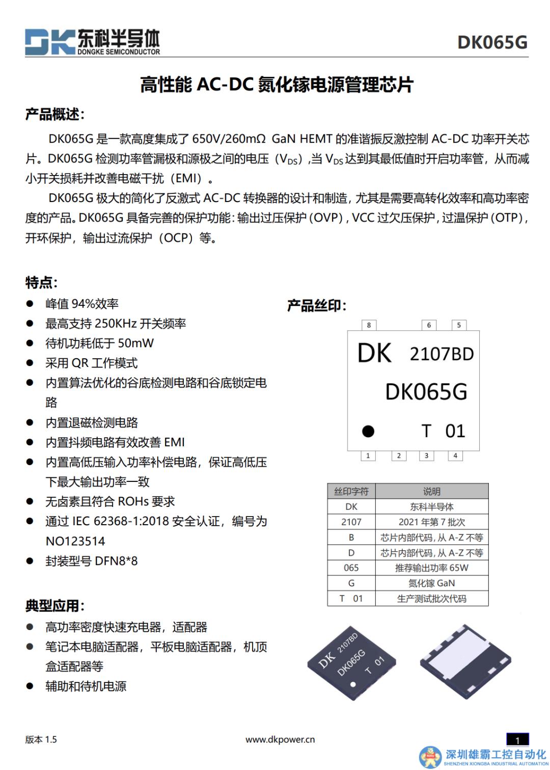 東科DK065G采用DFN8*8封裝,外圍元件精簡,適用于高功率密度快充適配器,筆記本電源適配器等應用。