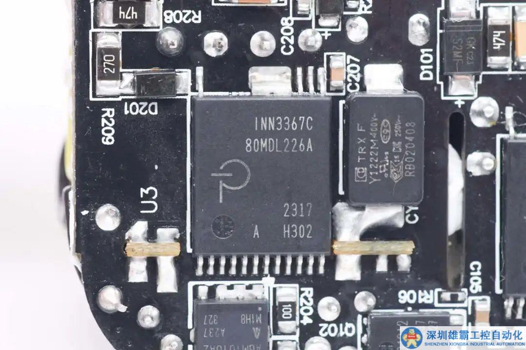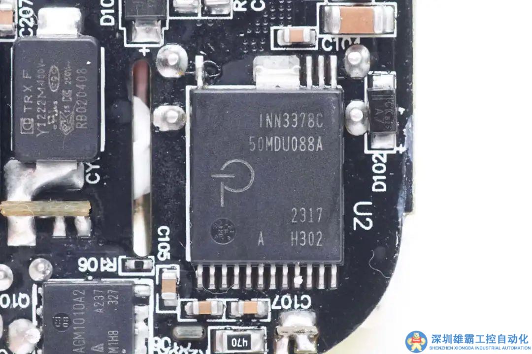 開關(guān)電源主控芯片采用PI INN3367C,為InnoSwitch3-Pro系列,是一顆集成了高壓開關(guān)、同步整流和FluxLink反饋功能的數(shù)控恒壓/恒流離線反激式準(zhǔn)諧振開關(guān)IC,適合應(yīng)用于高效率USB PD 3.0 + PPS/QC適配器,支持寬電壓40W適配器應(yīng)用。