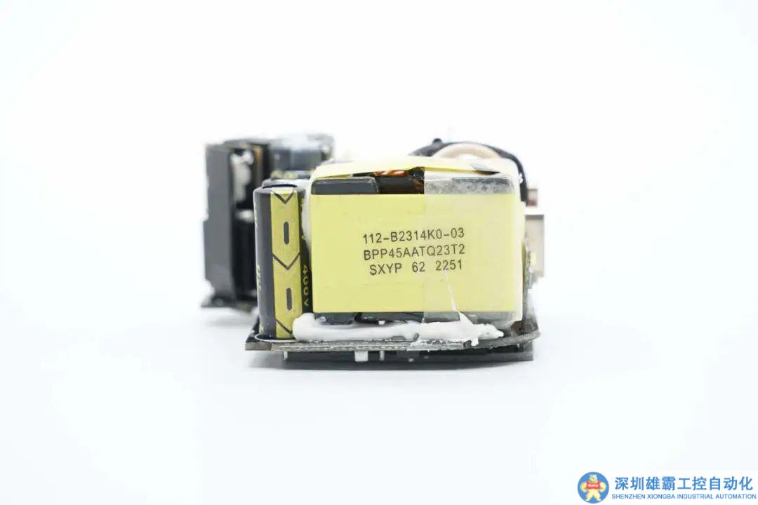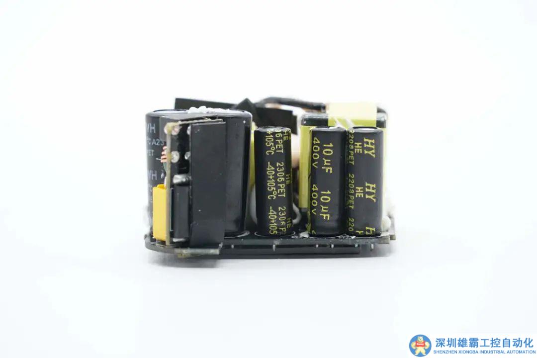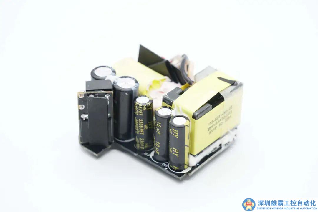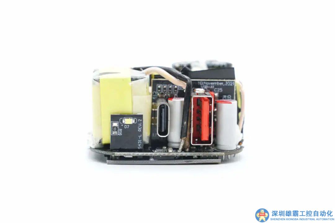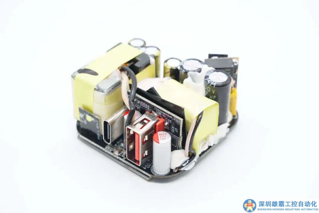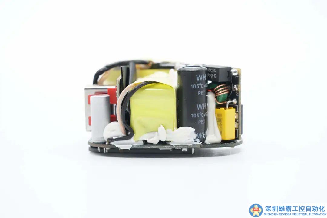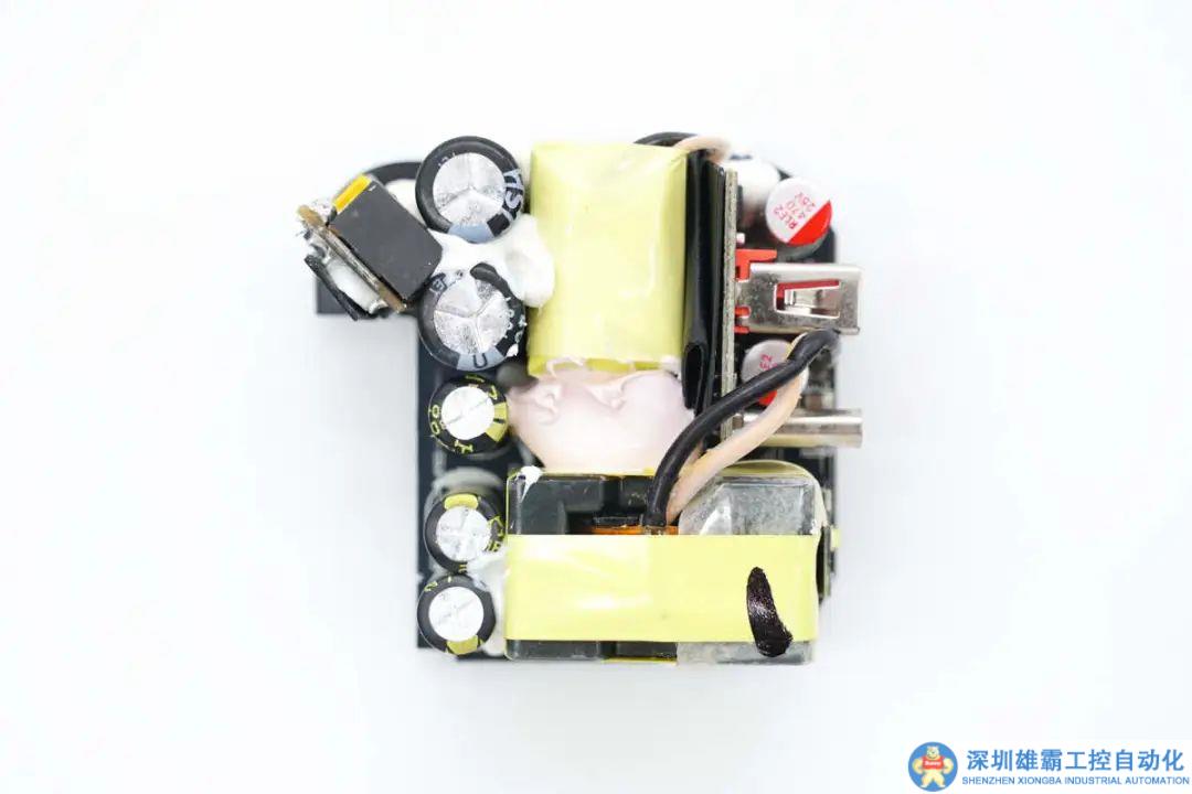 PCBA模塊正面一覽,左側(cè)焊接輸入小板,高壓濾波電容。向右焊接兩顆變壓器和協(xié)議小板,右上角焊接兩顆濾波電容。