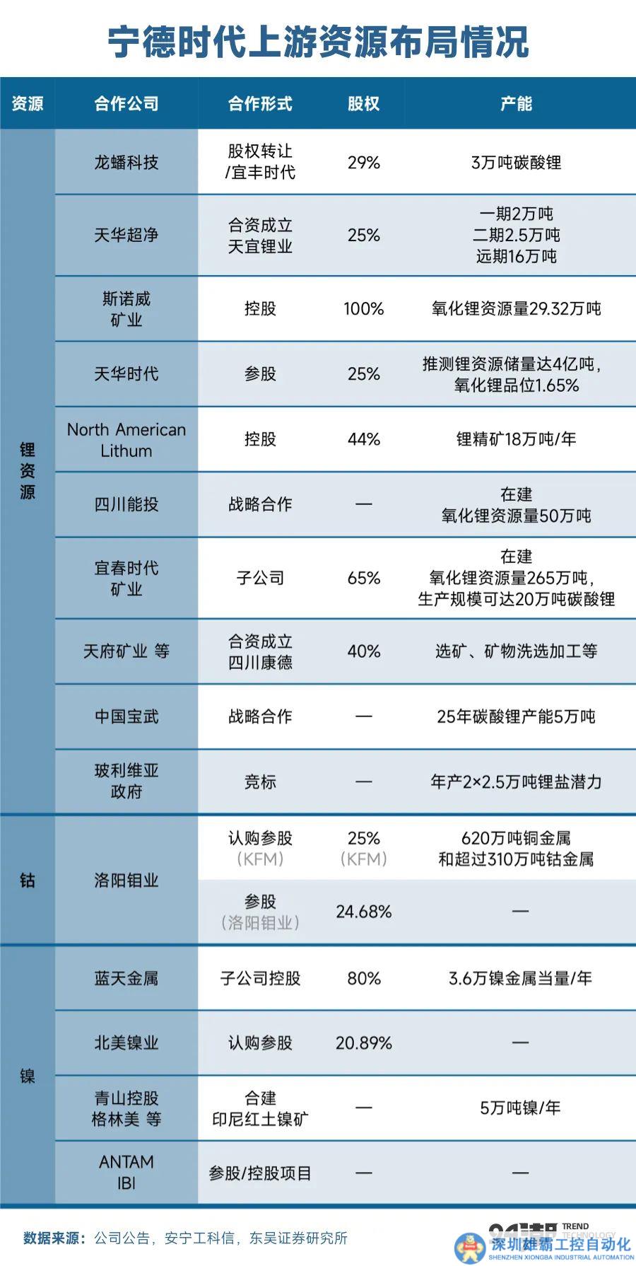 其二在一體化戰(zhàn)略布局方面:近幾年,為了應(yīng)對產(chǎn)業(yè)鏈上游原材料供給與價格的劇烈波動風(fēng)險,幾乎所有產(chǎn)業(yè)巨頭規(guī)都有有較深的一體化布局。其中寧德時代已經(jīng)通過自制開采、投資入股、合資合作等方式完成了在鋰、鈷、鎳資源領(lǐng)域的深度布局,打造供應(yīng)鏈韌性,詳見下表: