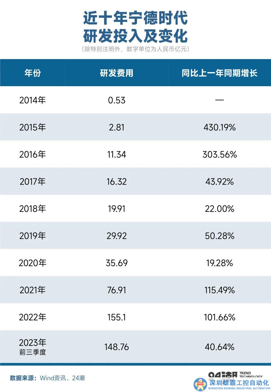筆者發(fā)現(xiàn),不論產(chǎn)業(yè)如何變化,寧德時代一直在加大研發(fā)方面的投入。比如據(jù)24潮統(tǒng)計,2023年前三季度寧德時代研發(fā)投入再次刷新了歷史新紀(jì)錄,達(dá)148.76億元,同比增長了40.64%(同期營業(yè)收入增幅為40.10%)。近十年間(2014年-2023年前三季度)研發(fā)投入累計達(dá)497.29億元,占營業(yè)總收入比例為5.40%。