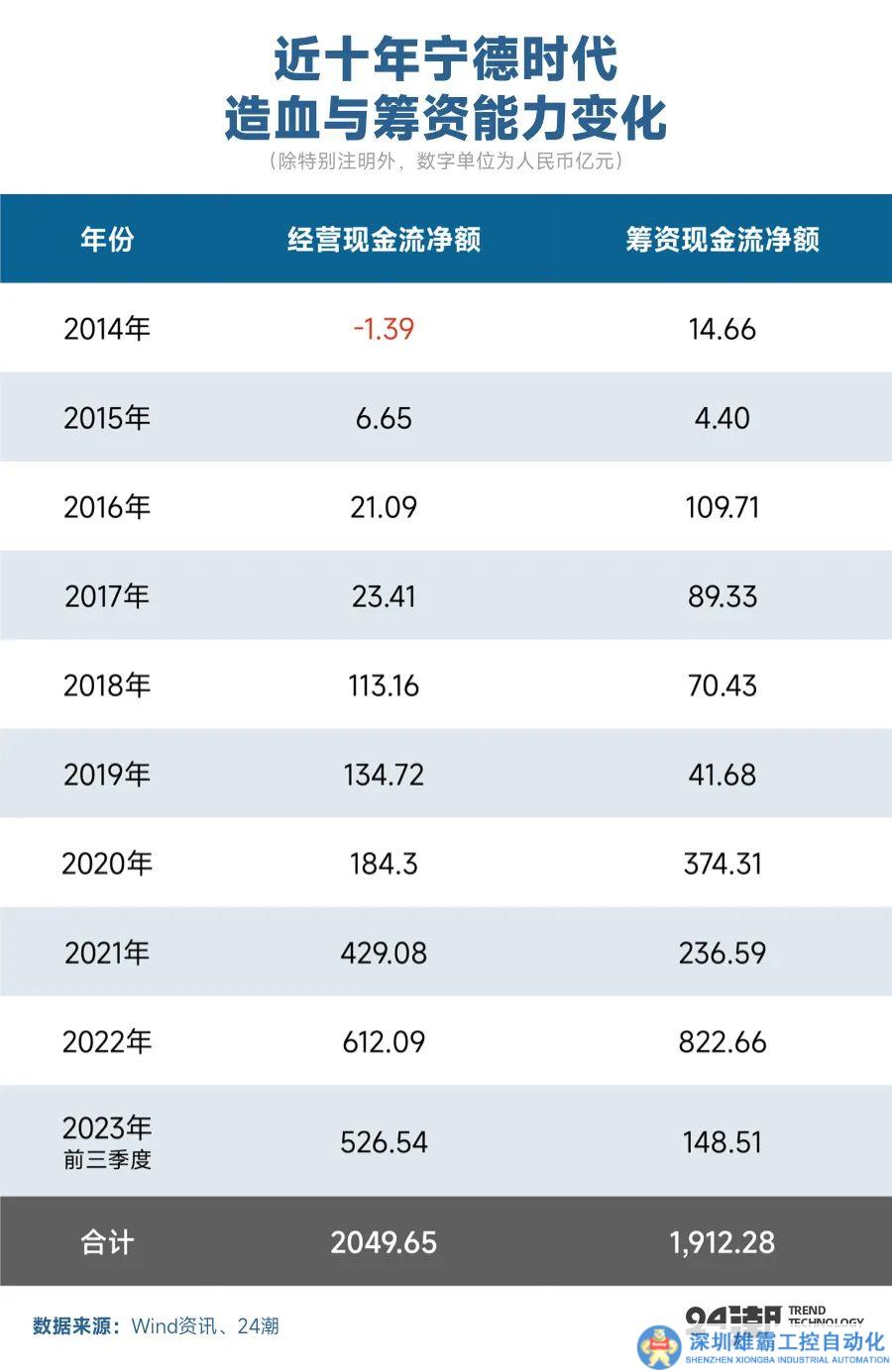 財報顯示,過去幾年間寧德時代一直在提升造血與籌資能力,據(jù)24潮統(tǒng)計,在2014年-2023年9月,寧德時代合計造血(經(jīng)營活動產(chǎn)生的現(xiàn)金流量凈額)2049.65億元,合計凈籌資(籌資活動現(xiàn)金流凈額)1912.28億元,僅這兩項合計為寧德時代提供了3961.93億元的現(xiàn)金流,為其兇猛投資布局與強(qiáng)勢崛起提供了強(qiáng)力支撐。