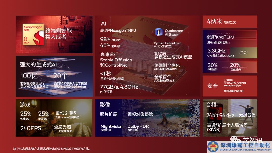 10月25日,移動(dòng)處理器大廠高通(Qualcomm)在驍龍峰會(huì)上正式發(fā)布新一代旗艦移動(dòng)平臺(tái)——驍龍8 Gen3。這也是高通首款以生成式AI為核心設(shè)計(jì)的移動(dòng)平臺(tái)。