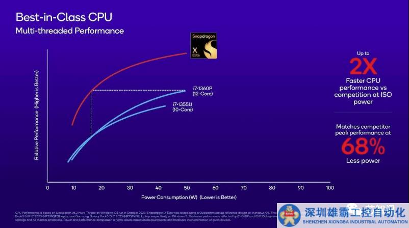 根據(jù)高通公布的數(shù)據(jù)顯示,如果跟英特爾12核的i7-1360P和10核的i7-1355U處理器相比,高通驍龍X Elite的CPU性能提高2倍,但功耗降低了68%。