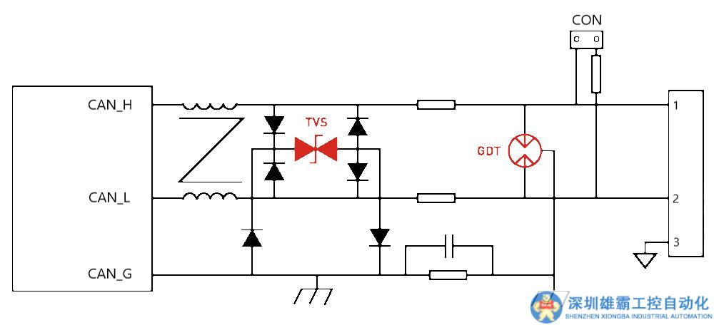 合理的保護(hù)電路可以極大地提高CAN總線接口的抗干擾能力。我們常見的保護(hù)電路有TVS鉗位電路、旁路濾波電容、氣體放電管等,可以使尖峰過充等被上述器件提供的旁路泄放到地,從而保證傳輸線上的峰值干擾控制在安全范圍內(nèi)。同時還可以增加ESD防護(hù)器件,亦可起到靜電防護(hù)作用。