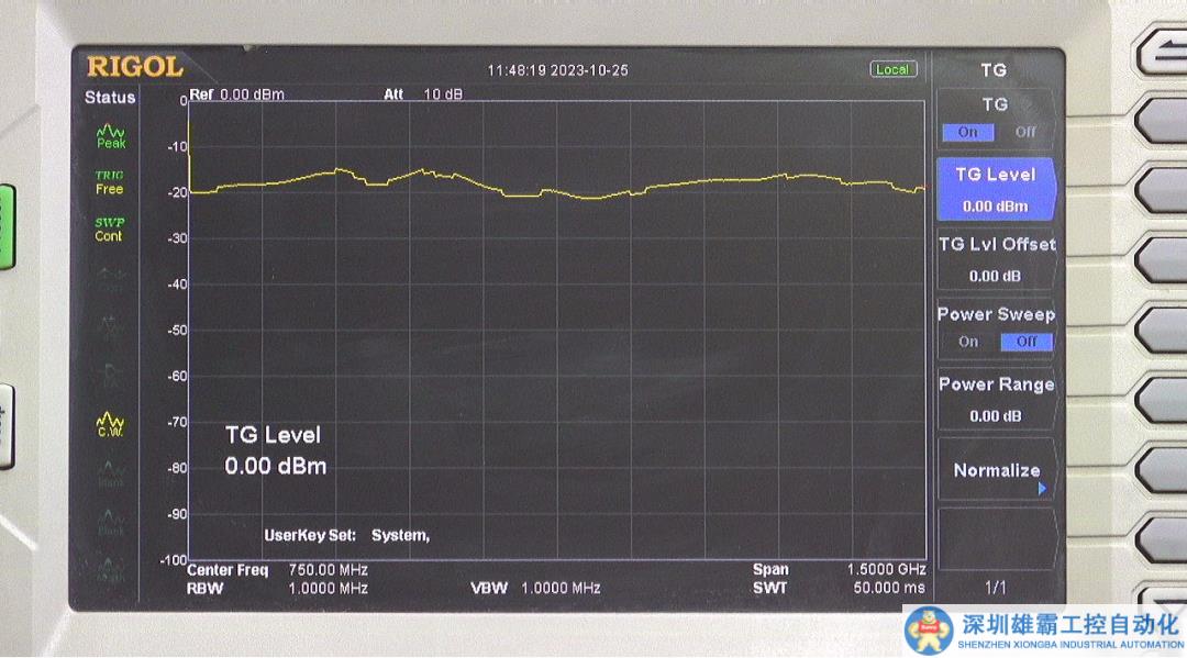 ??為了確定剛才測(cè)量頻譜曲線究竟反映是 TG 特性,還是駐波橋的特性?,F(xiàn)在將頻譜儀的信號(hào)輸出直接連接到信號(hào)輸入。這是測(cè)量所得到的頻譜,可以看到與前面駐波橋所測(cè)量的結(jié)果是有區(qū)別的,特別是在有的頻率范圍內(nèi),損失特性正好相反。由此可見(jiàn),前面所測(cè)量的是駐波橋頻率特性。