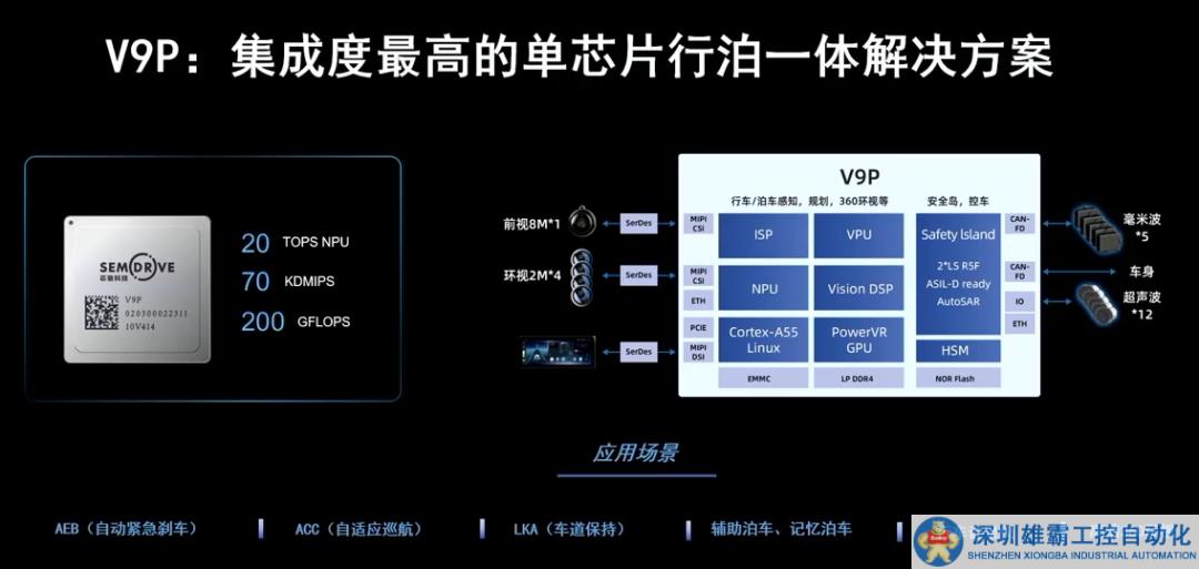 V9P是我們智駕的一款典型芯片產(chǎn)品,它的CPU算力是70KDMIPS,GPU是200GFLOPS,NPU是20TOPS,可以實(shí)現(xiàn)單芯片的行泊一體解決方案。
