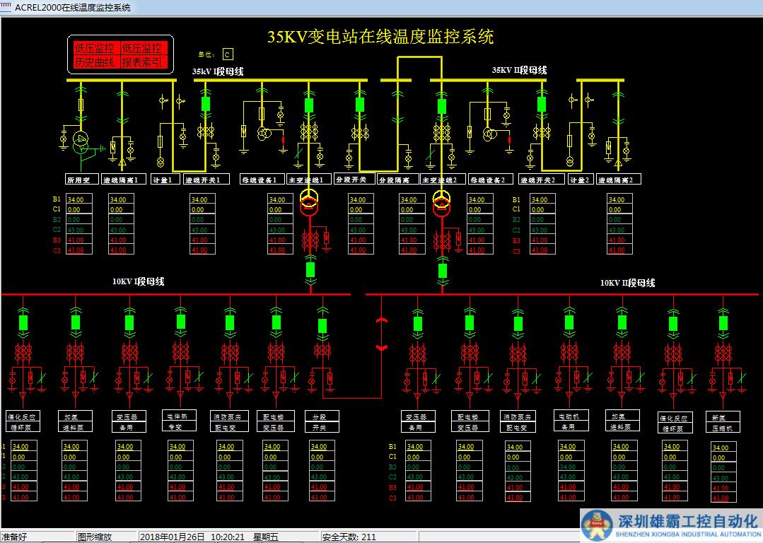④顯示溫度實時監(jiān)測。實時溫度曲線繪制每個監(jiān)測點溫度的當日實時曲線,實現(xiàn)溫度數(shù)據(jù)曲線圖和列表分析。⑤測溫數(shù)據(jù)信息可進行遠傳共享??扇谌刖C自系統(tǒng),將溫度數(shù)據(jù)與綜自系統(tǒng)集成、集中顯示、報警。⑥故障報警及記錄查詢(可根據(jù)故障類型、時間、部位等進行查詢)。