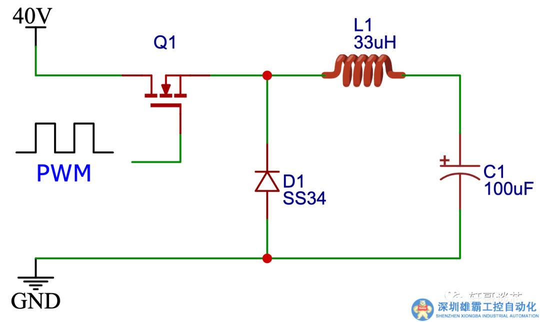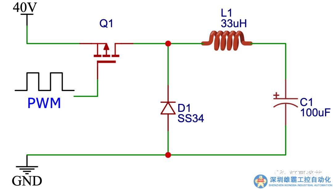 上圖中展示的 Bcuk 電路中選用的是 PMOS 來作為開關(guān)管進(jìn)行斬波控制,因此,我們知道只需要在 Q1 的 Vgs 施加負(fù)電壓就可以順利打開 MOS 管 Q1。但是,從MOS 管的生產(chǎn)工藝上我們了解到,PMOS 的導(dǎo)通電流往往做不到很大,相同成本下,NMOS 的導(dǎo)通電流可以做到更大,也就是 Rdson 可以做到相對較低。因此Buck 電路中會將開關(guān)管從 PMOS 更換為 NMOS,如下圖所示。