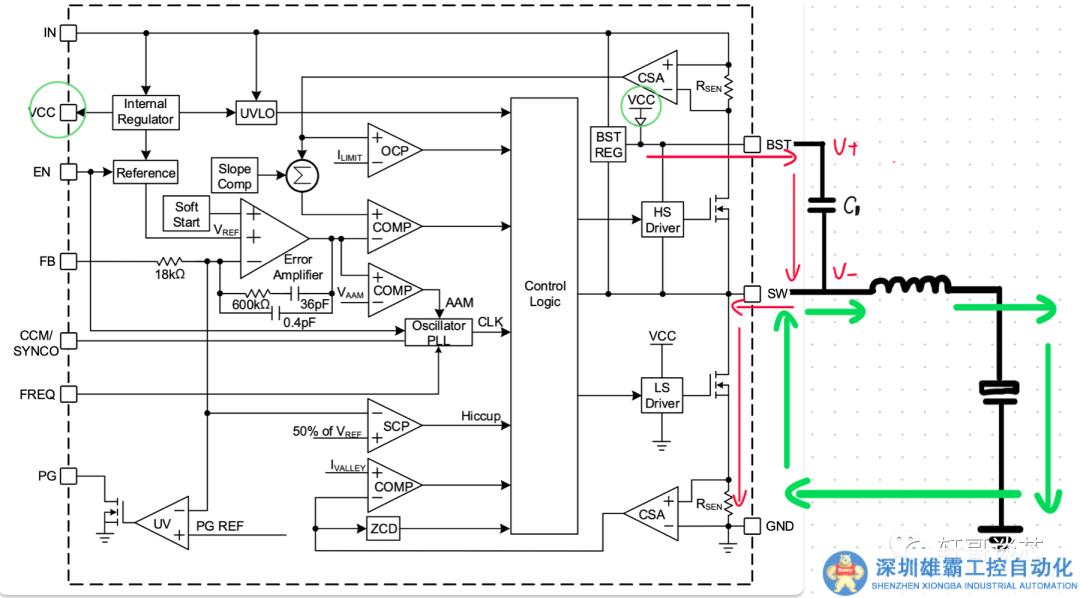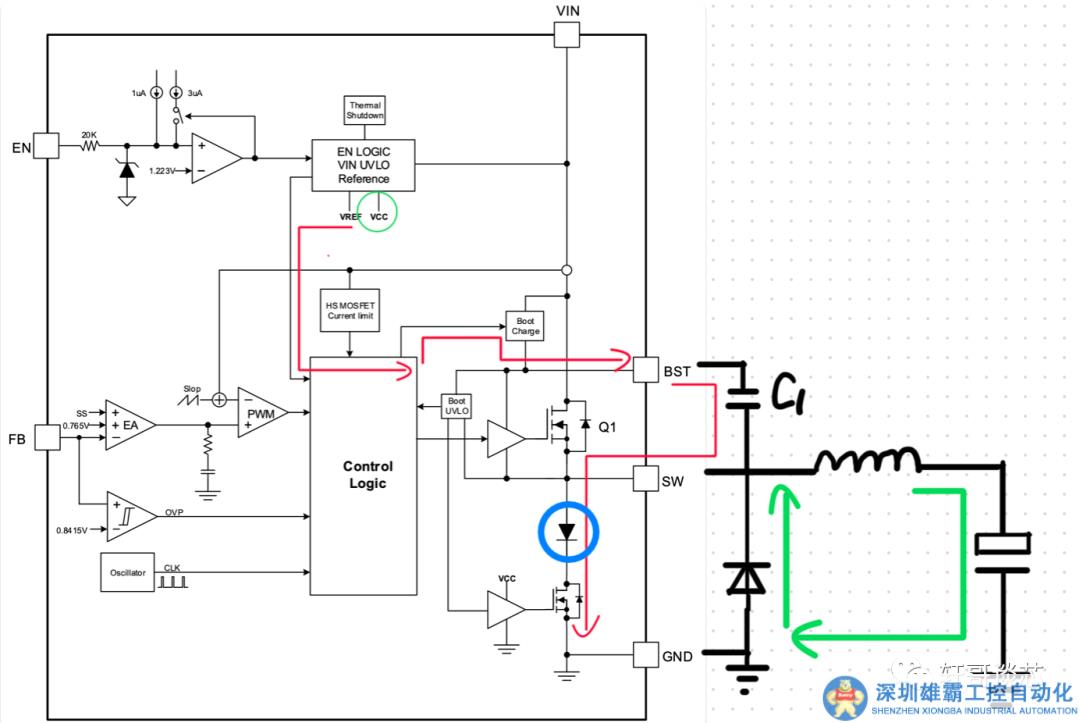 框圖中,兩個綠色圓圈的 VCC 是 DC-DC 芯片內(nèi)部穩(wěn)壓出來的一個可以驅(qū)動 MOS 開啟的電壓,也可以供芯片內(nèi)部其他邏輯電路使用,這里你可以理解為上一章節(jié)中 IR2014 的輸入電壓 12V。然后就跟 H 橋電路中的邏輯一樣,當(dāng)?shù)瓦?MOS 管通過 LS Driver (這里可以直接用 VCC 驅(qū)動,因為是低邊的 NMOS)導(dǎo)通時,自舉電容的回路通過紅色箭頭的回路進(jìn)行充電,將自舉電容兩端電壓 V+和 V-之間充到 VCC 的電壓。此時,buck 電路處于續(xù)流狀態(tài),因此綠色箭頭表示的是電源輸出與負(fù)載回路的續(xù)流回路。當(dāng)續(xù)流完畢,低邊 NMOS 將被關(guān)閉,高邊 NMOS 將由 HS Driver 選擇將 C1 電容直接并接在高邊 NMOS 的 GS 兩端,高邊 NMOS 打開為電感補(bǔ)充能量。如果 DC-DC 中的高邊 NMOS 換成一個 PMOS 的話,我們就沒有必要大費(fèi)周折的去給一個電容充電了,直接給一個比系統(tǒng)輸入電壓 VIN 低一些電壓就可以打開高邊的 PMOS 了。