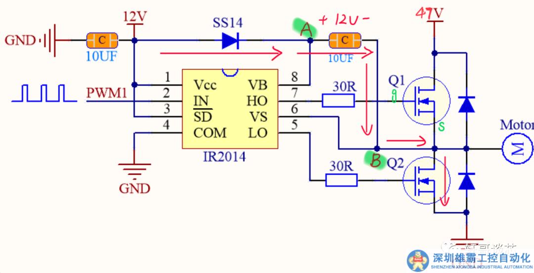 首先,上下橋的兩個 MOS 管不可以同時導(dǎo)通,那么在下管導(dǎo)通的時候,上圖中紅色箭頭標(biāo)注的是自舉電容的充電回路。在這個階段,自舉電容的 AB 兩端被充電為 12V。下一個階段,下管關(guān)閉,此時上管 Q1 的 S 極處于浮動狀態(tài),IR2014 內(nèi)部將 VB 引腳鏈接到 HO 引腳即可在 Q1 的 GS 兩極并聯(lián)上充滿電的自舉電容,因此 Vgs = 12V,使得 Q1 導(dǎo)通。如此循環(huán),上管關(guān)閉后,下管打開,再繼續(xù)為自舉電容充電,為下一次上管打開做準(zhǔn)備。