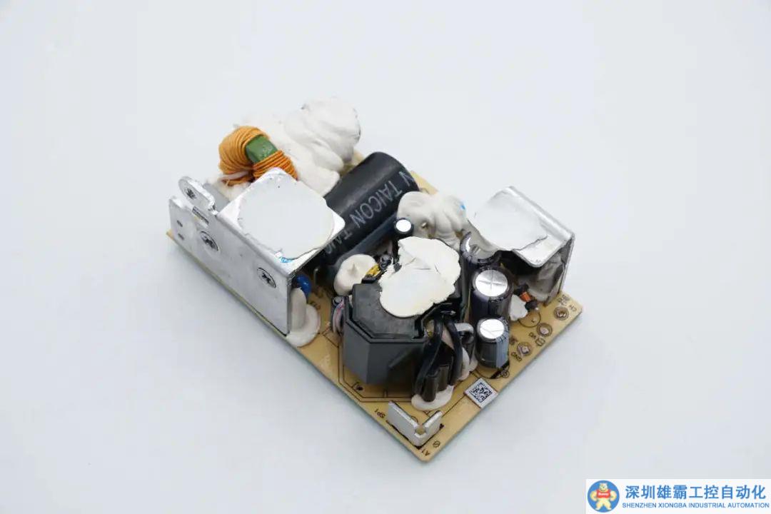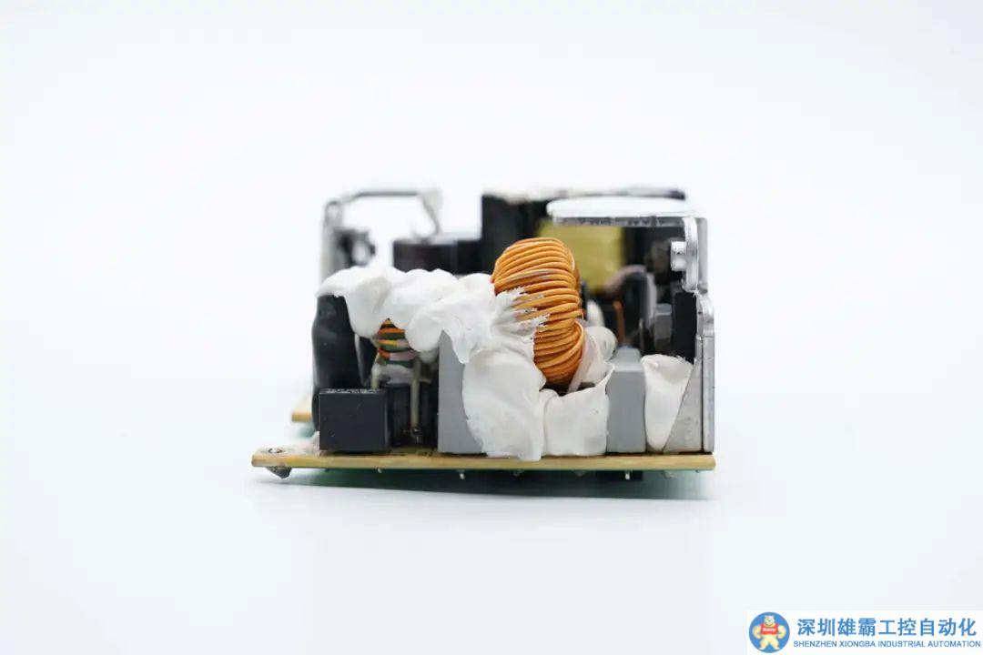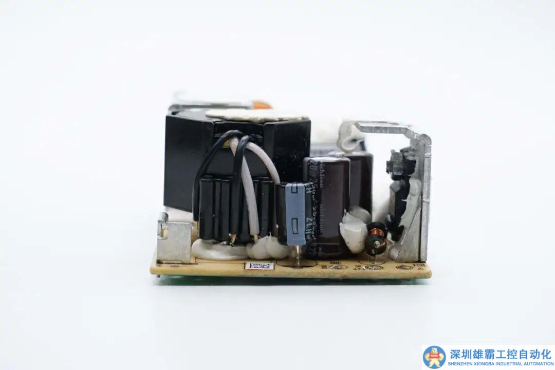 PCBA模塊正面一覽,右側焊接輸入保險絲和EMI電路,右上方散熱片固定整流橋,初級開關管,左上方為變壓器,變壓器右側為高壓濾波電容,變壓器下方是輸出濾波電容和整流管。