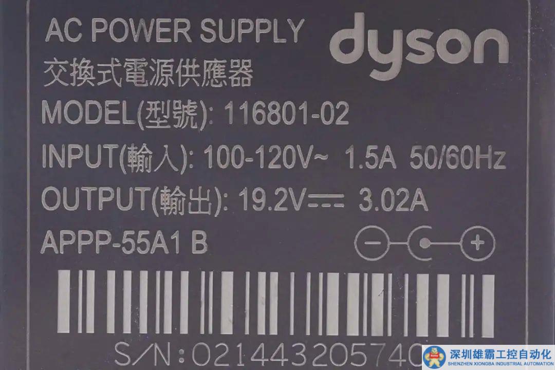 戴森這款電源適配器為灰色外殼設計,配有美規(guī)固定插腳,自帶2米長輸出線纜,圓孔插頭輸出。這款適配器支持寬電壓輸入,輸出規(guī)格為19.2V 3.02A,輸出功率為58W。