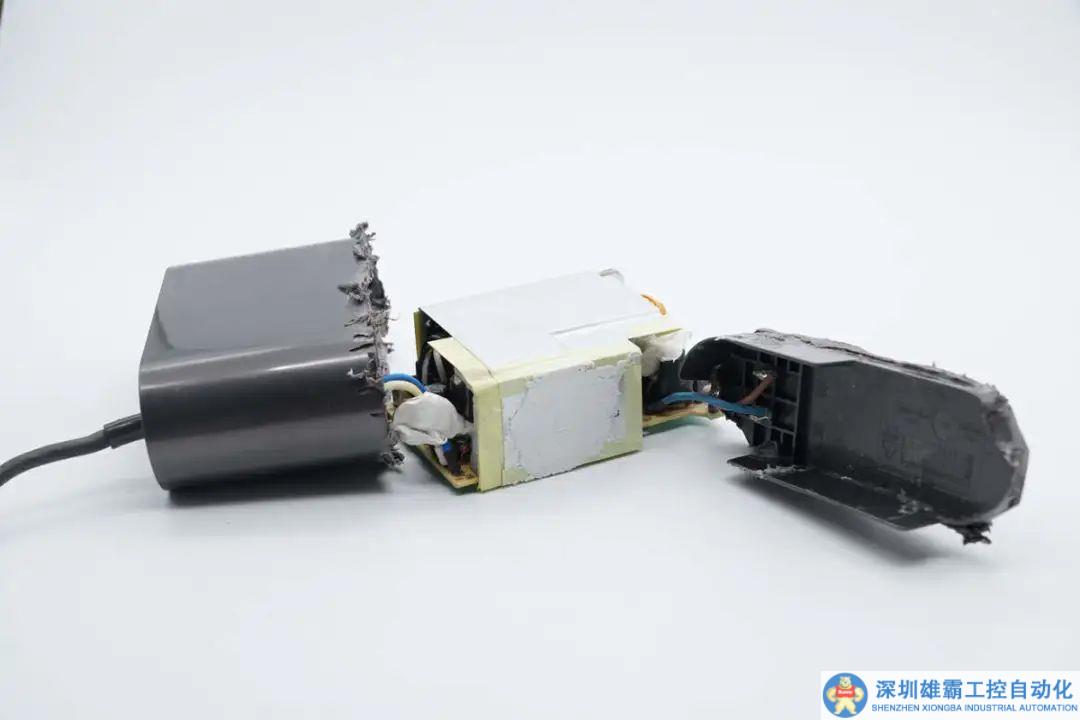 沿殼體接縫拆開適配器外殼,內(nèi)部PCBA模塊通過導線焊接供電。