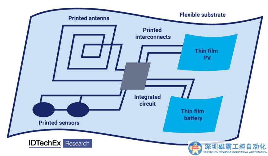FHE是在柔性基板上結(jié)合印刷功能和安裝組件的電路,它需要印刷和非印刷功能的結(jié)合。例如,導(dǎo)電互連,薄膜電池、天線、聚合物太陽能電池甚至顯示器都可以印刷在柔性基板上,而存儲器和處理能力將通過光刻置于單獨生產(chǎn)的IC(硅或金屬氧化物)上,然后安裝在基板上。
