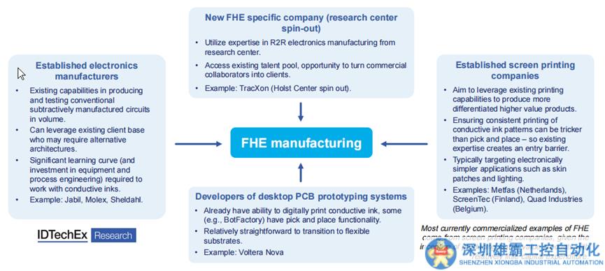 老牌電子產(chǎn)品制造商可能轉(zhuǎn)向FHE制造,還有新的FHE特定公司、桌面PCB原型系統(tǒng)的開發(fā)人員,以及絲網(wǎng)印刷公司等。目前,F(xiàn)HE大多數(shù)商業(yè)化例子都來自絲網(wǎng)印刷公司,因為他們的動機是用相對較少的資本支出生產(chǎn)價值更高的產(chǎn)品。