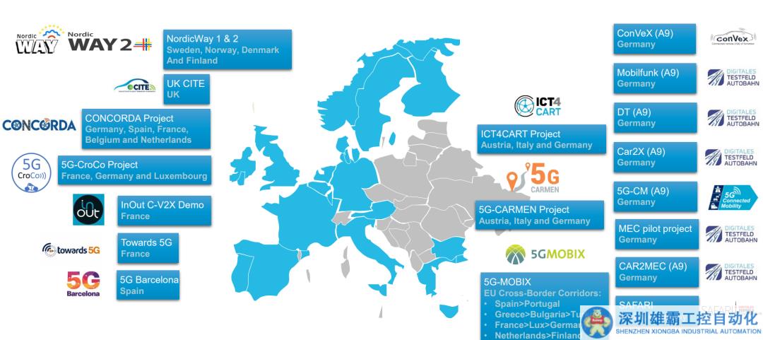 歐洲有眾多的組織和項(xiàng)目在推進(jìn)C-V2X/5G相關(guān)的測(cè)試和實(shí)驗(yàn)局,大致如圖4所示。例如: