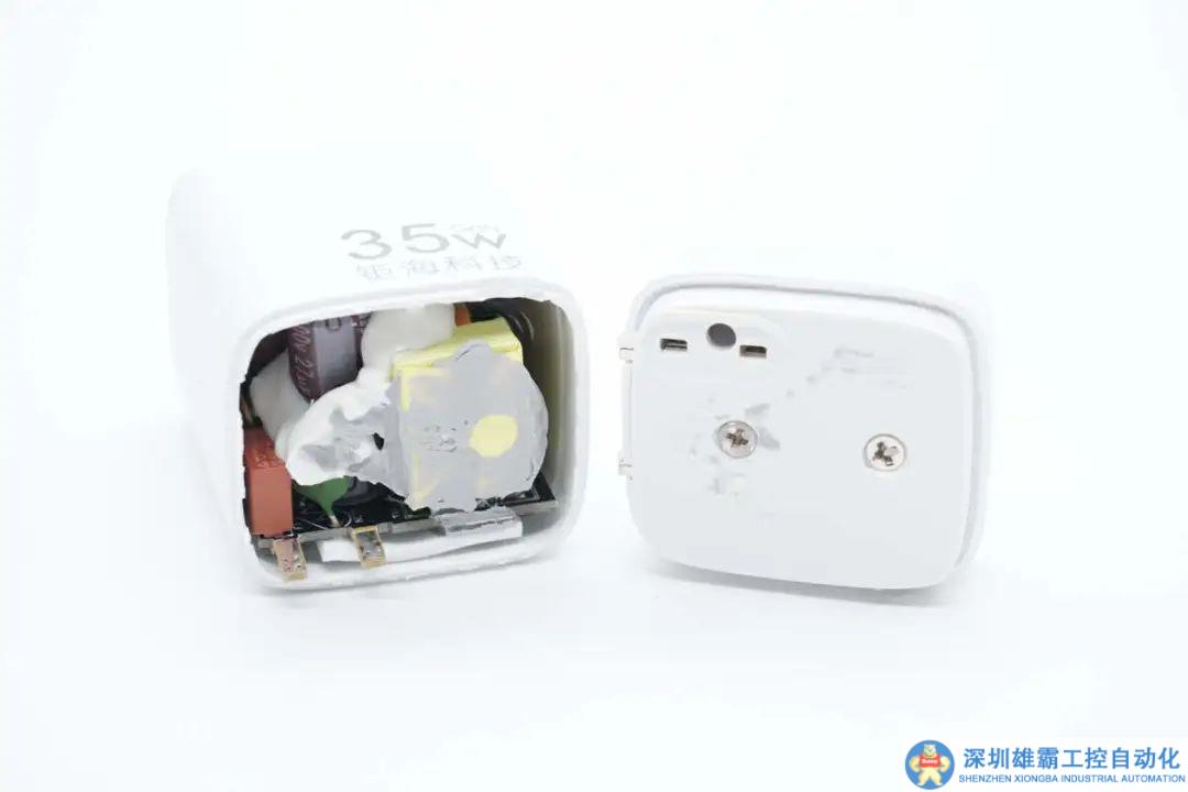 首先沿外殼接縫拆開充電器外殼,PCBA模塊通過舌片連接折疊插腳。