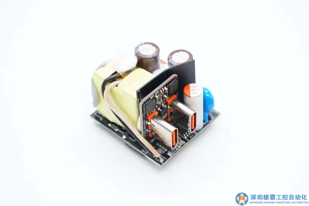 PCBA模塊正面一覽,左上角為輸入端,焊接保險絲,NTC浪涌抑制電阻,共模電感。下方焊接高壓濾波電容,差模電感。左下方焊接變壓器。在右上角焊接藍色Y電容和輸出濾波電容,右下角焊接協(xié)議小板,小板上焊接USB-C母座和協(xié)議芯片。