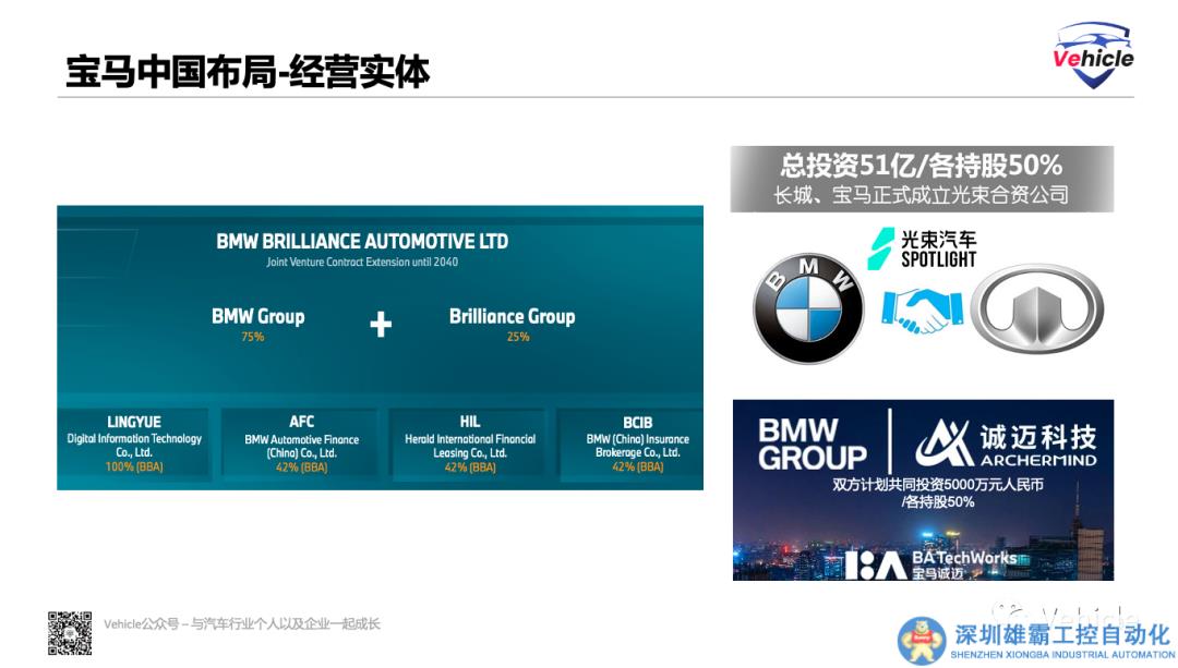 當(dāng)然以上為主要經(jīng)濟(jì)以及投資實(shí)體,華晨寶馬下屬還有四家公司:領(lǐng)悅數(shù)字信息技術(shù)有限公司,100%華晨寶馬子公司,寶馬汽車(chē)金融(中國(guó))有限公司,華晨寶馬占股42%。先鋒國(guó)際融資租賃有限公司,華晨寶馬占股42%。寶馬(中國(guó))保險(xiǎn)經(jīng)紀(jì)有限公司,華晨寶馬占股42%。主要是IT,銷(xiāo)售,生產(chǎn)等支持業(yè)務(wù)。寶馬當(dāng)前在中國(guó)銷(xiāo)售的汽車(chē)85%來(lái)自于沈陽(yáng)制造,其中60%的供應(yīng)鏈來(lái)自于遼寧。與長(zhǎng)城汽車(chē)合資的光束汽車(chē),這兩個(gè)合資企業(yè)都可以額外獲得當(dāng)?shù)爻杀窘Y(jié)構(gòu)。