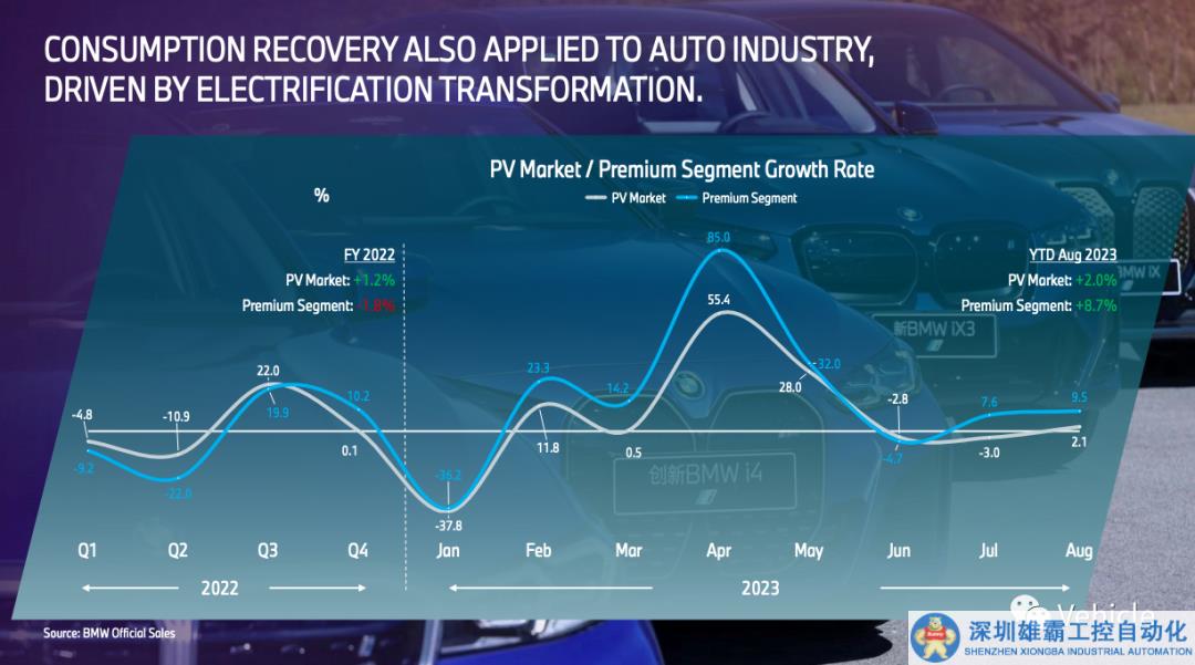 汽車(chē)消費(fèi)同樣復(fù)蘇,但更多的是被電氣化轉(zhuǎn)型驅(qū)動(dòng)。根據(jù)寶馬的數(shù)據(jù),中國(guó)乘用車(chē)目前為止增長(zhǎng)2%,其中豪車(chē)市場(chǎng)增長(zhǎng)8.7%。