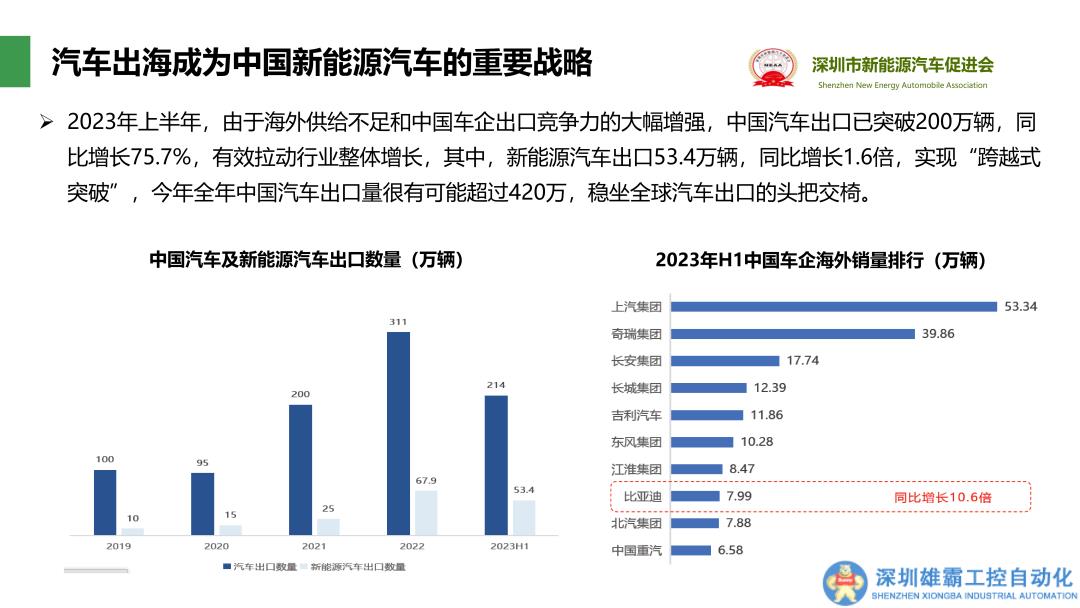 在談到海外市場表現(xiàn)時,汪家紅指出:“汽車出海已成為中國新能源汽車的重要戰(zhàn)略。”從2021年下半年至今,國內新能源汽車出口量快速激增。據統(tǒng)計,2023年上半年,由于海外供給不足和中國車企出口競爭力的顯著增強,中國汽車出口已突破200萬輛,同比增長75.7%,其中,新能源汽車出口53.4萬輛,占比接近25%。