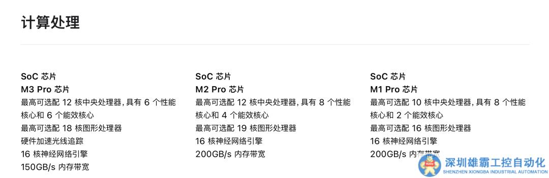 打開Apple網(wǎng)頁(yè)中Mac的對(duì)比頁(yè)面,我們可以輕松找到M3 Pro、M2 Pro和M1 Pro三代“Pro”芯片對(duì)應(yīng)電腦的配置列表。在“SoC芯片”一欄中,我們可以看到M3 Pro和M2 Pro的核心配置情況:M3 Pro和M2 Pro同為大小核12C處理器,其中M3 Pro采用的6P+6E的方案,而M2 Pro采用的卻是8P+4E的方案。